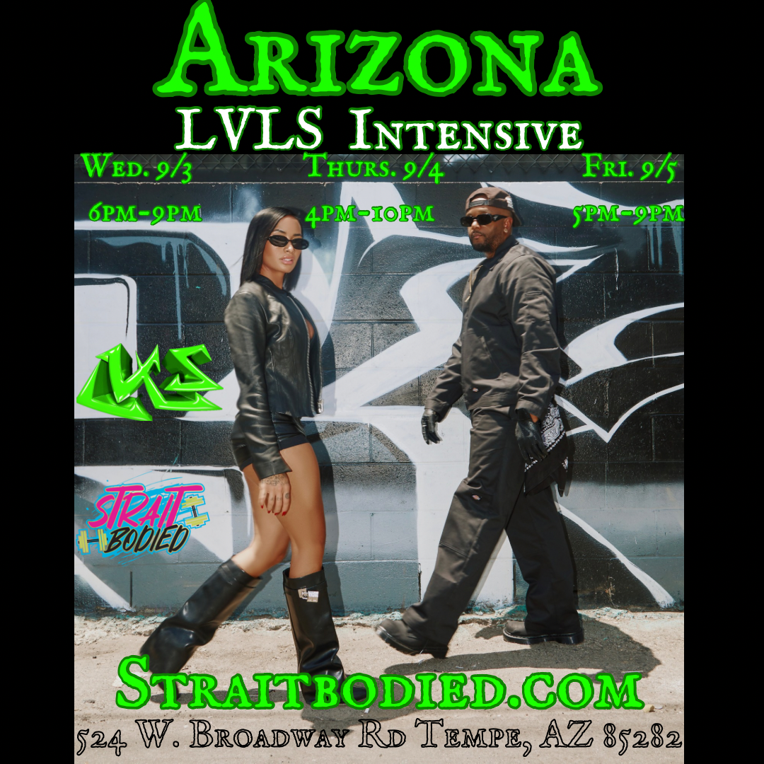 Flyer for Arizona LVLS Intensive event showing two people in black clothing and sunglasses standing in front of graffiti wall, with event details and website.